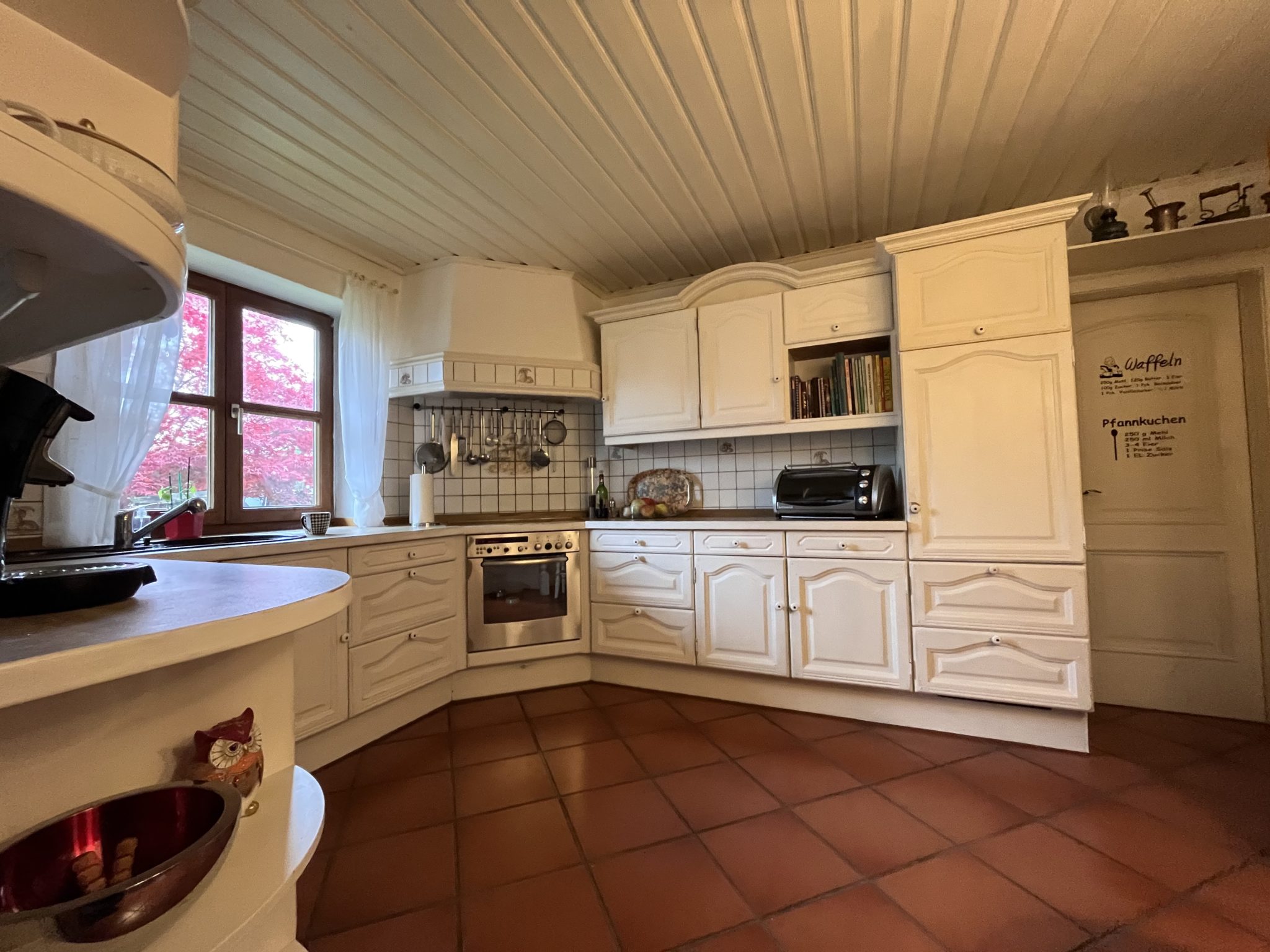 Im Eingangsbereich finden Sie genügend Platz für Ihre Garderobe. Von hier aus gelangen Sie in das Gäste-WC, den Keller, in die Küche sowie in den offenen Wohn- und Essbereich. Zur optischen Trennung wurde hier ein freundlicher Raumteiler verbaut. Ebenso finden Sie hier einen Kachelofen, der eine besonders gemütliche Atmosphäre und angenehme Wärme vermittelt. Vom Wohnbereich aus kommen Sie auf die überdachte Terrasse. Komplettiert wird dieses Geschoss mit einer sehr gepflegten und attraktiven Einbauküche im Landhausstil und einer Speise.