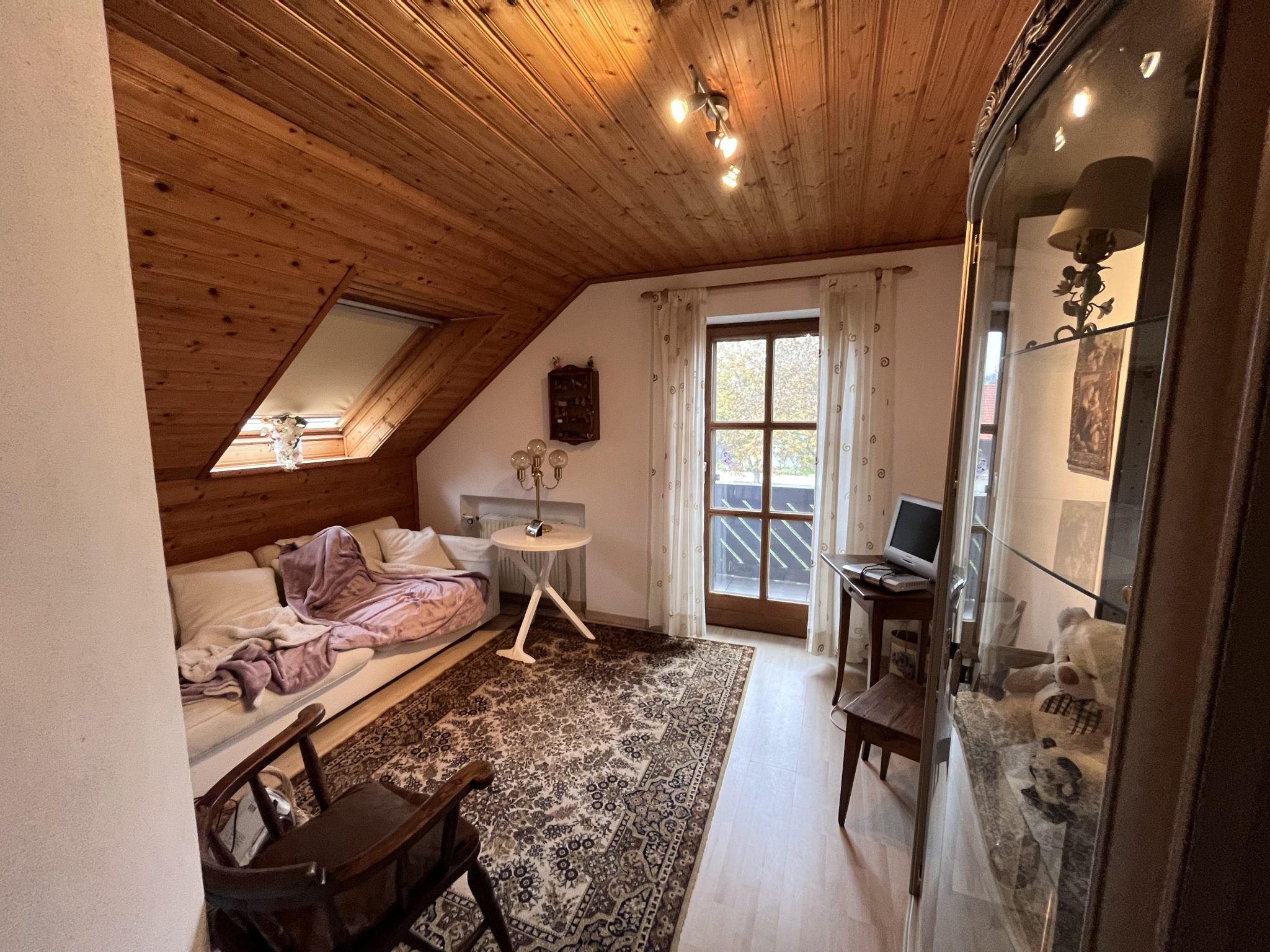 Über eine rustikale Holztreppe im Flur gelangen Sie in den Keller und das obere Geschoss. Im Obergeschoss finden Sie ein großzügiges Schlafzimmer, zwei weitere Schlafräume und das hell geflieste Badezimmer. Hier wurde eine geräumige Eckbadewanne, eine Dusche und ein Doppelwaschbecken verbaut. Die Schlafräume sind mit hellem Laminat ausgestattet. Zwei Schlafräume bieten Ihnen Zugang zum Balkon.