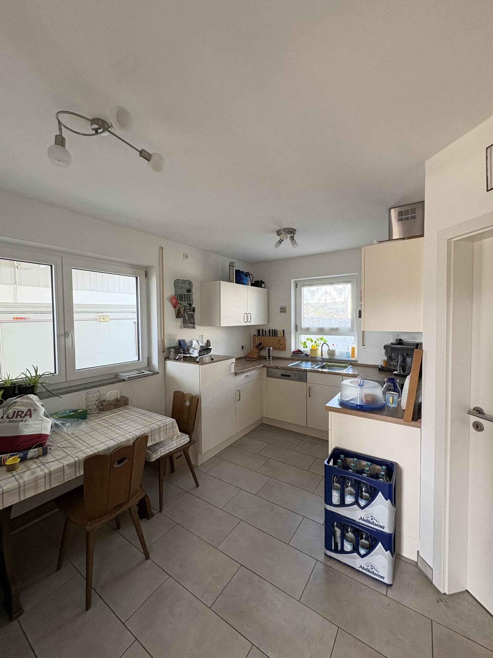 Schon beim Eintreten wird das stimmige Wohnkonzept spürbar. Der Eingangsbereich ist vom Treppenhaus abgetrennt und verfügt neben einer Garderobe über ein Gäste-WC. Das Erdgeschoss präsentiert sich mit einem großzügigen, lichtdurchfluteten Wohn- und Essbereich, der direkten Zugang zur sonnigen Südterrasse gewährt. Von hier aus eröffnet sich der Blick in den ca. 350 m² großen, liebevoll angelegten Garten mit idealer Südausrichtung – ein perfekter Ort für entspannte Stunden im Freien. Die separat angeordnete Küche mit praktischer Speisekammer bietet kurze Wege und funktionale Abläufe. Die Einbauküche kann vom Vormieter abgelöst werden.