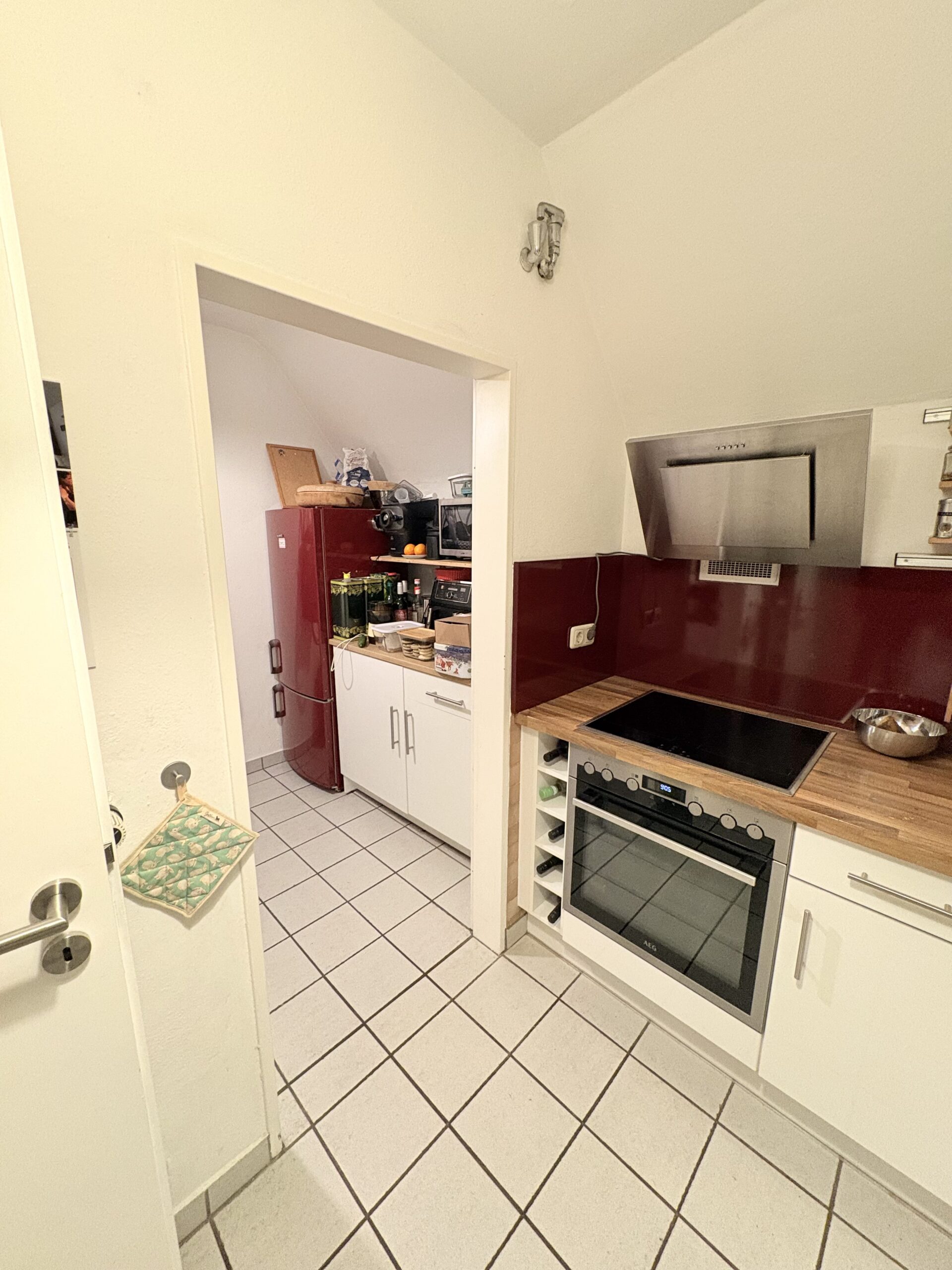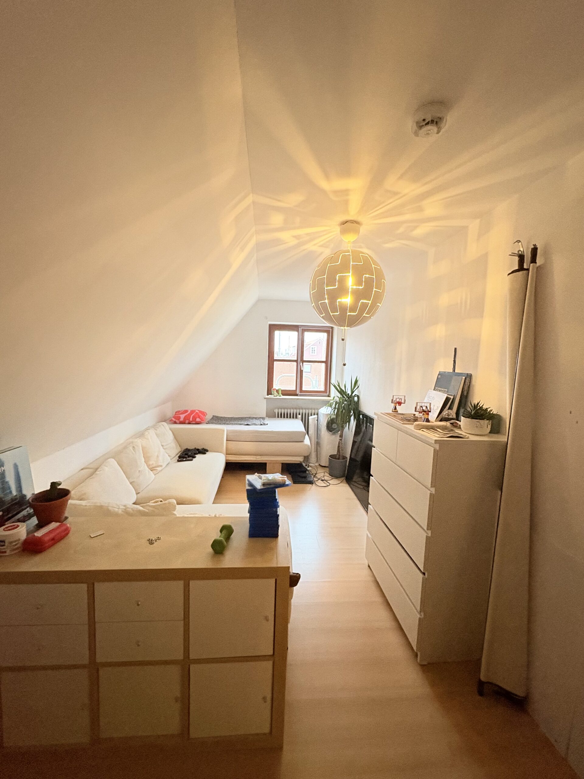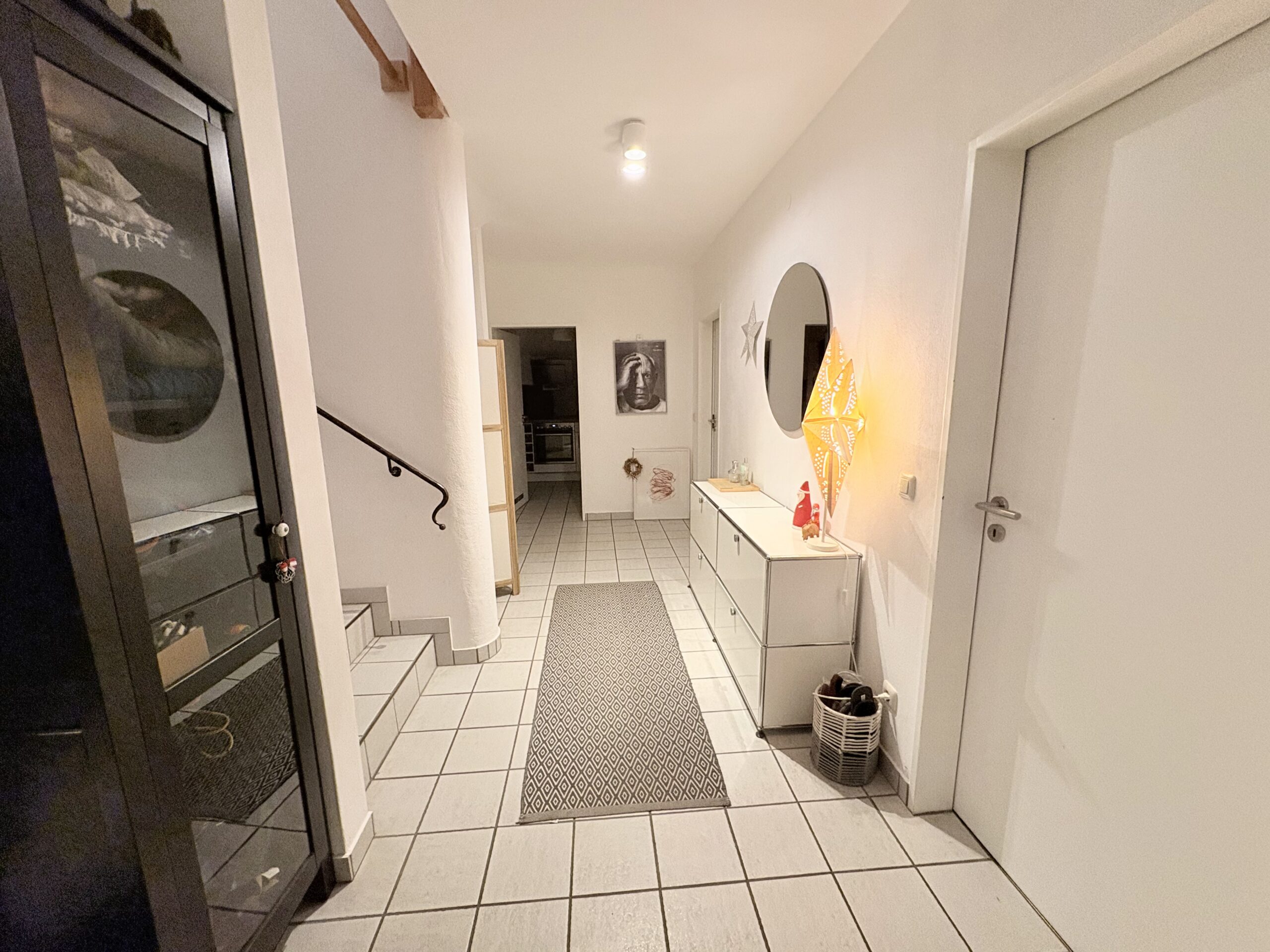 Bereits beim Betreten der Wohnung empfängt Sie ein großzügiger Eingangsbereich mit ausreichend Platz für eine Garderobe. Von hier aus gelangen Sie in die Räumlichkeiten der unteren Wohnebene. Diese umfasst ein Gäste-WC, eine separate Küche mit angrenzender Speisekammer, ein Schlafzimmer sowie einen offen gestalteten Wohn- und Essbereich. Dieser bietet direkten Zugang zum Balkon – ein idealer Ort für entspannte Nachmittage und gemütliche Abende mit einem beeindruckenden Blick über die Dächer von Landshut.