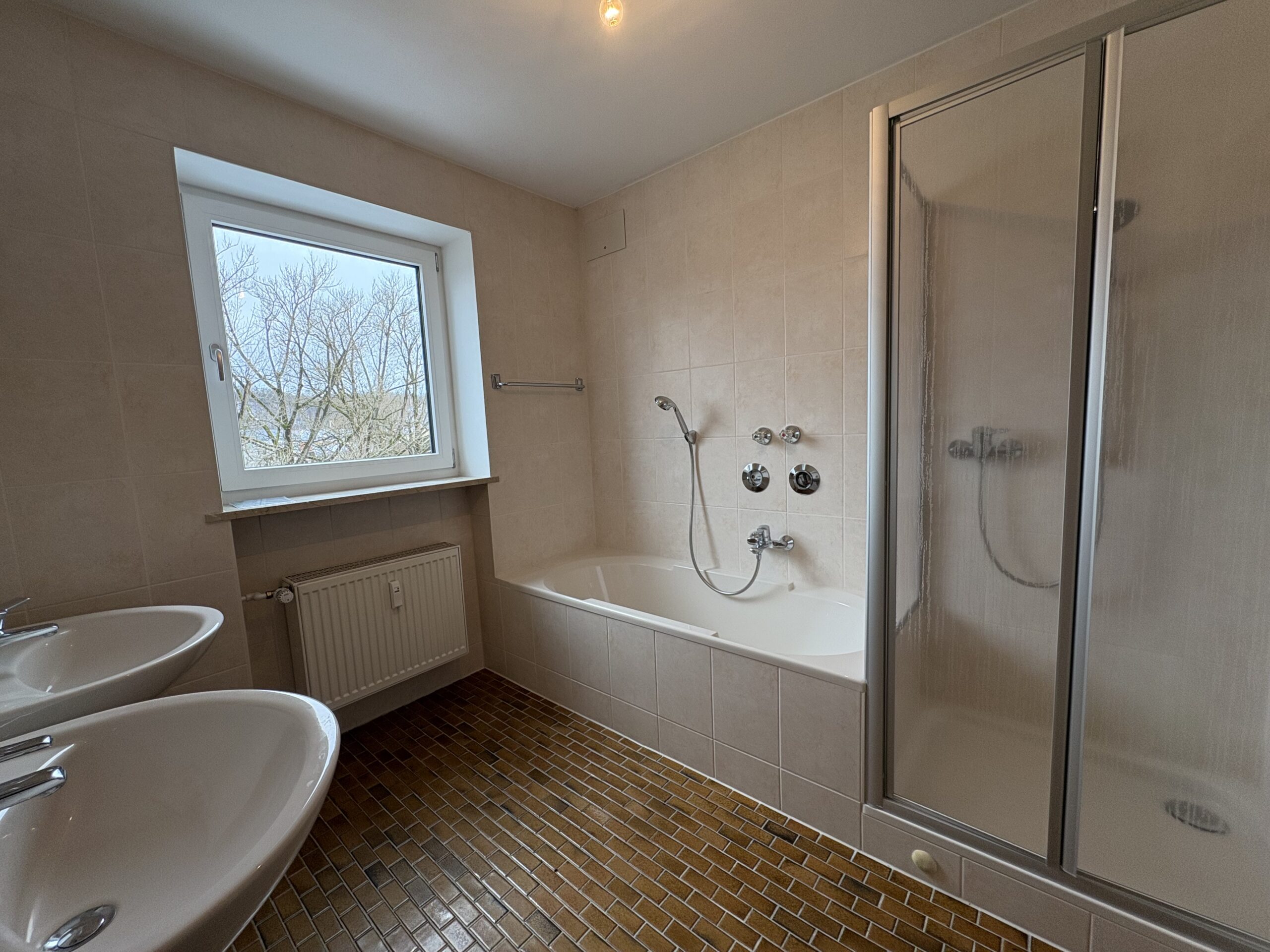 Das große, freundliche Badezimmer ist mit Dusche und Badewanne ausgestattet. Zudem bietet der Raum ausreichend Platz für eine Waschmaschine und einen Trockner. Sämtliche Fenster wurden im Januar 2024 durch moderne Kunststofffenster mit Dreifachverglasung und integrierter Zwangsentlüftung ersetzt.