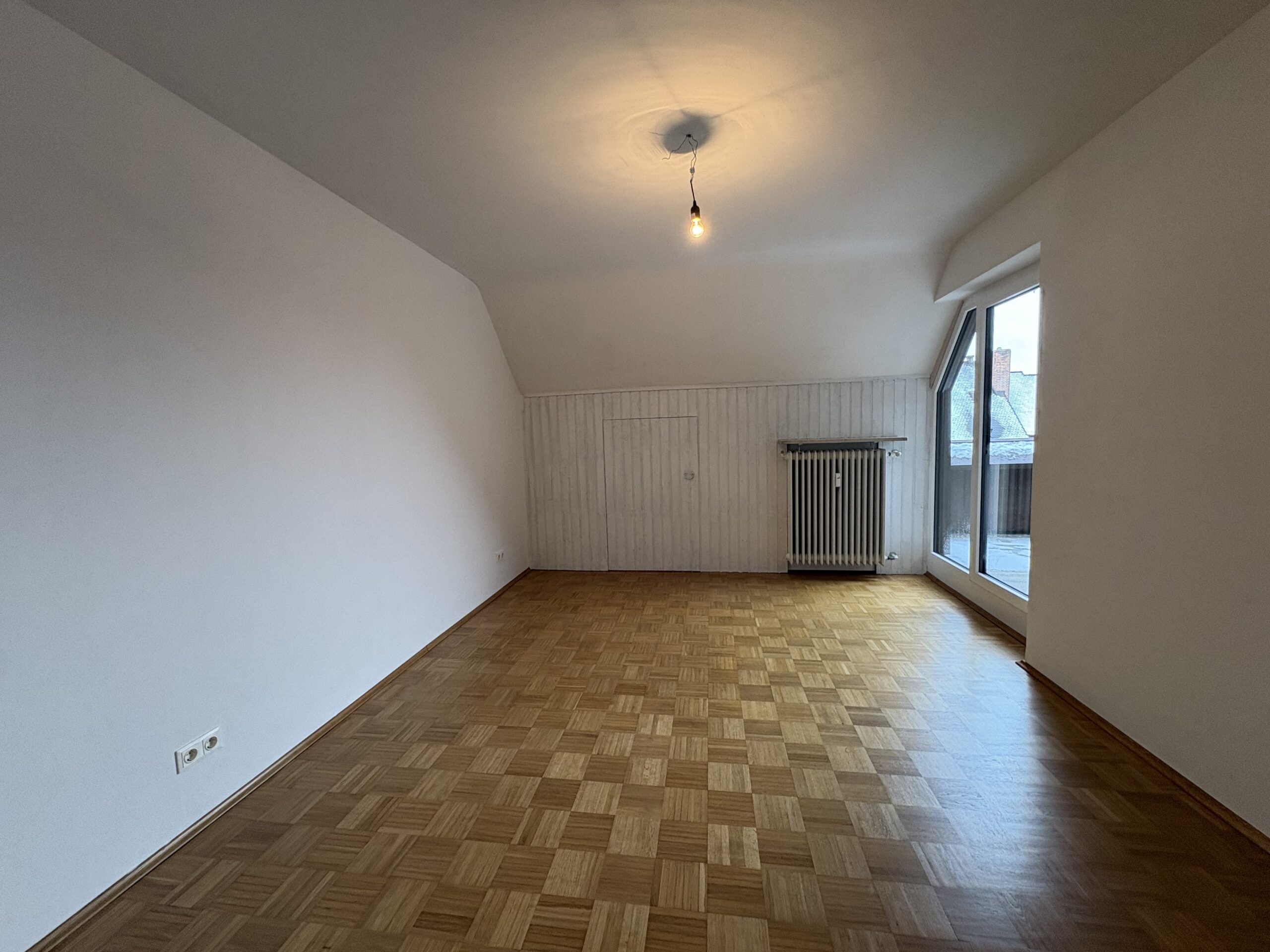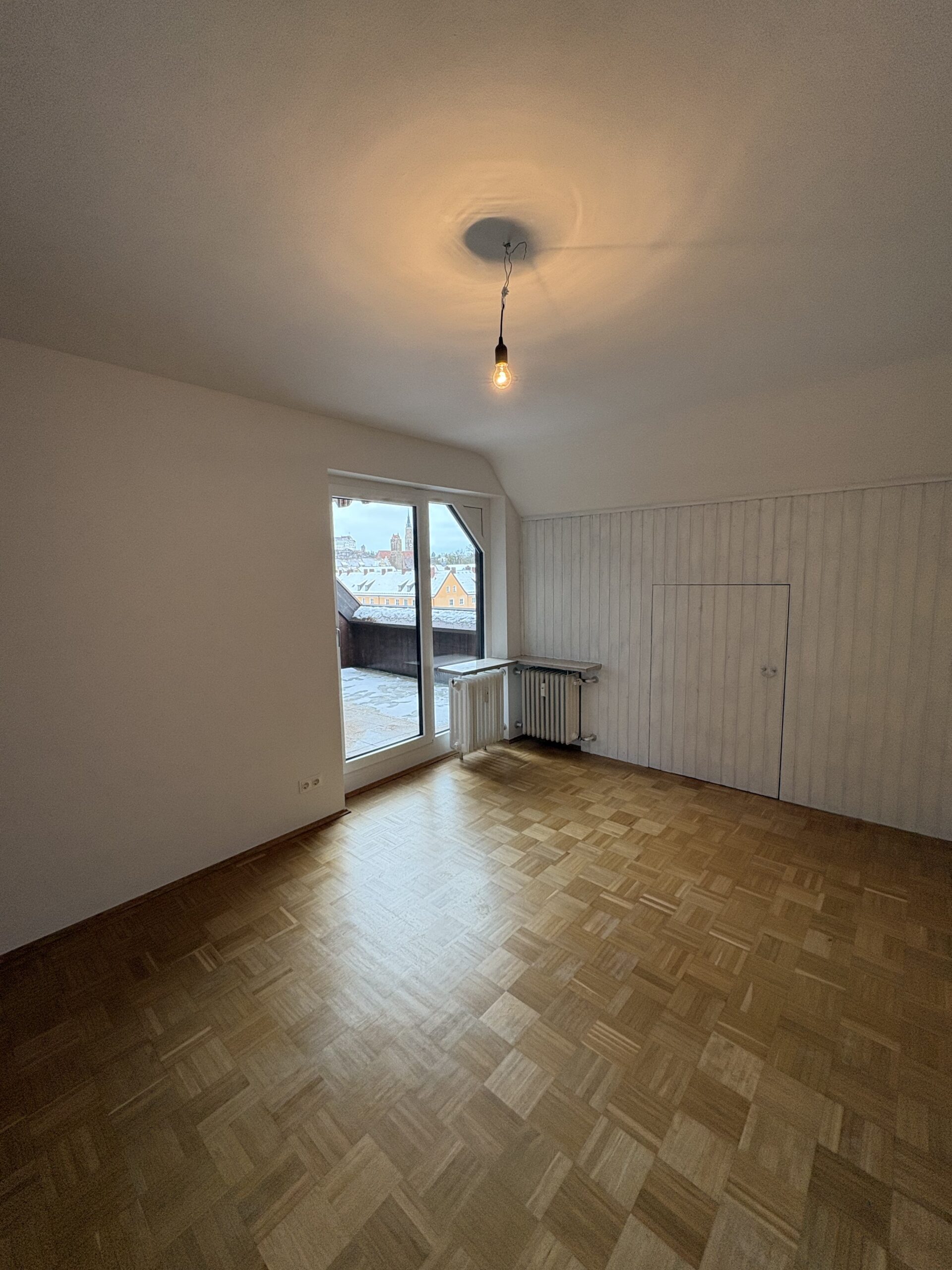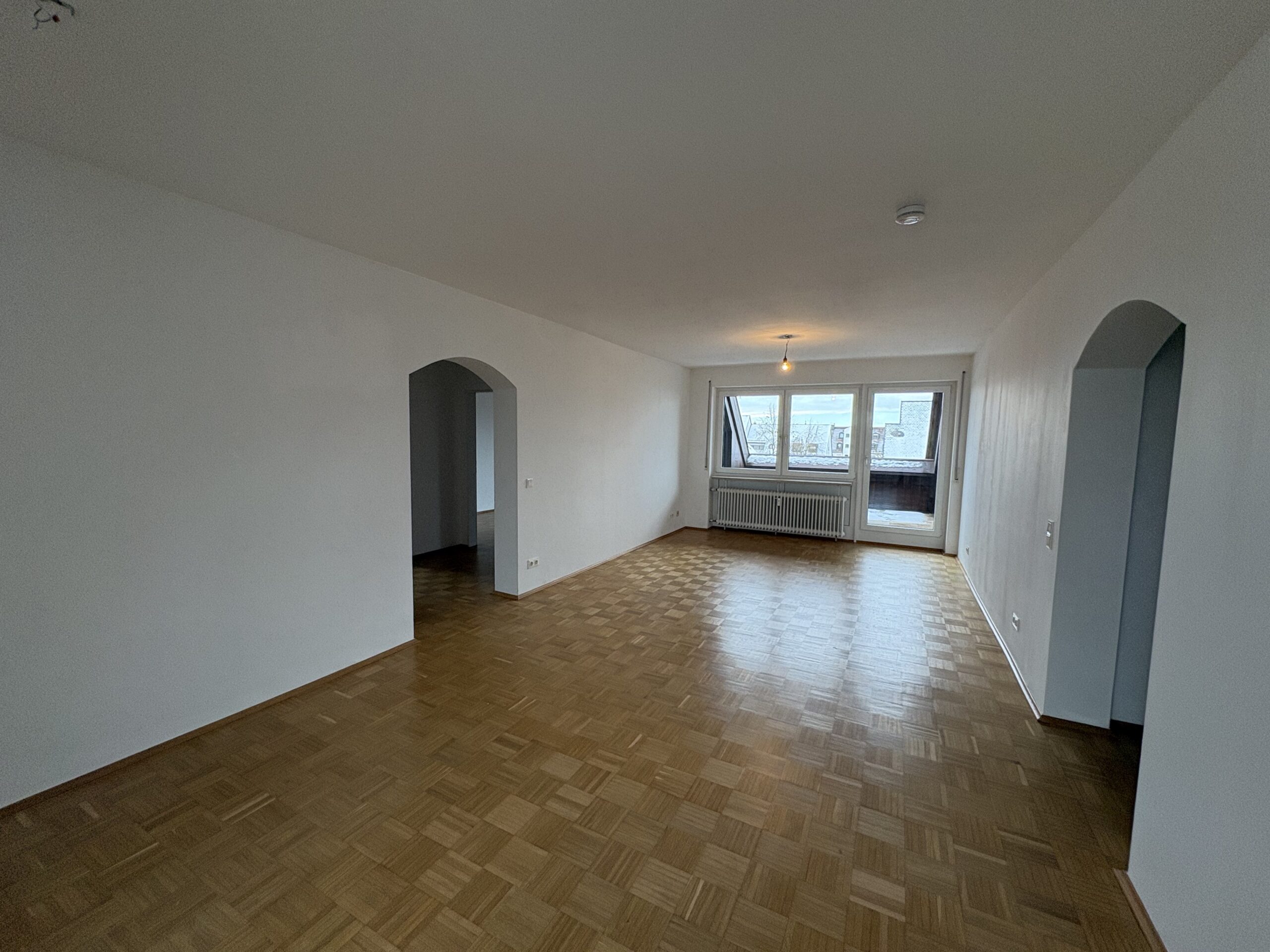 Der lichtdurchflutete Wohnbereich öffnet sich zur Loggia mit Sonnenmarkise – ein idealer Ort für erholsame Nachmittage und entspannte Abende mit Blick über die Dächer von Landshut bis hin zur Burg Trausnitz.