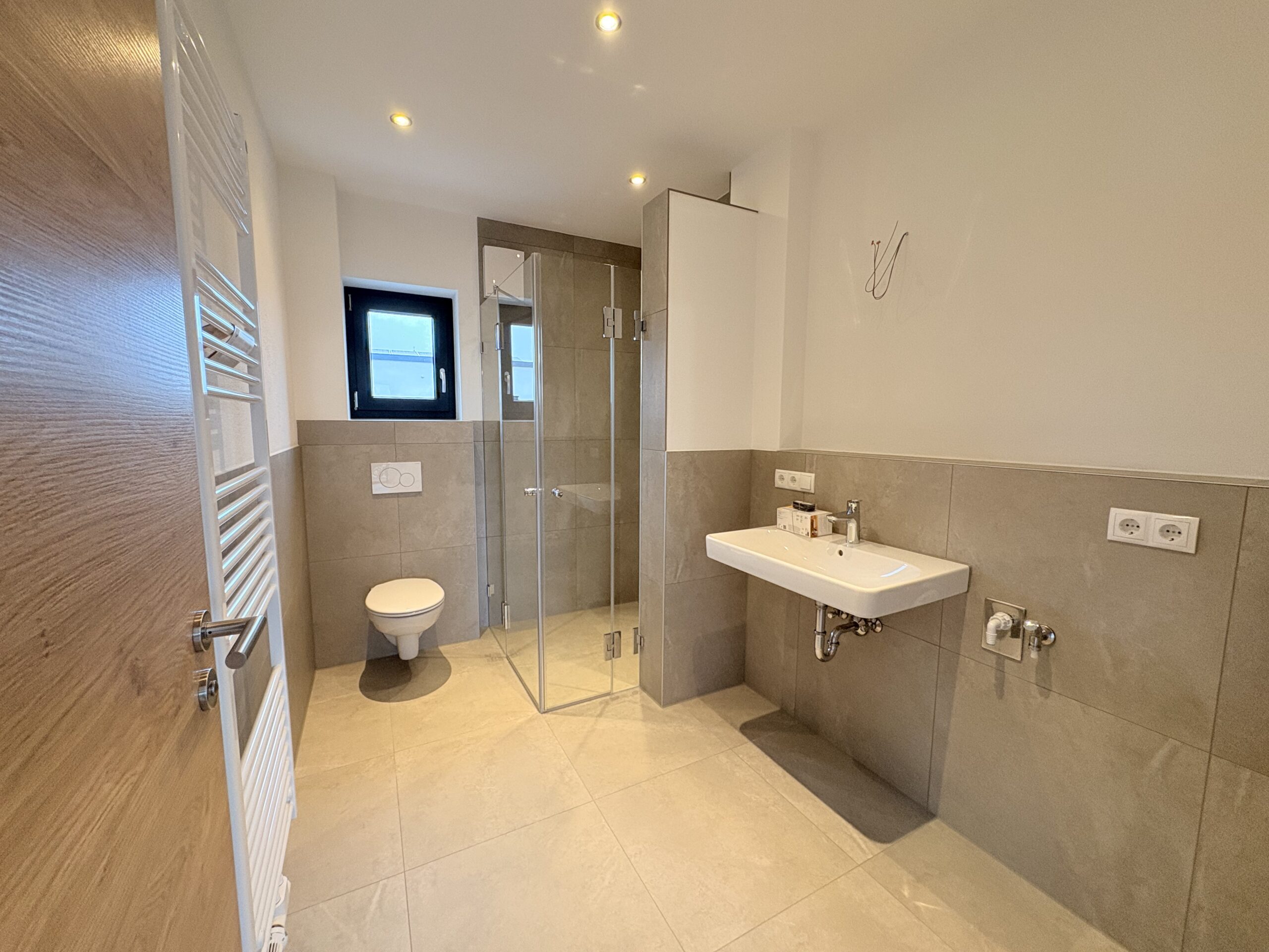 Beim Betreten der Wohnung erwartet Sie ein einladender Eingangsbereich mit ausreichend Platz für eine Garderobe. Das modern geflieste Badezimmer ist mit großformatigen Fliesen, einer bodengleichen Dusche sowie einer funktionalen Wandtuchheizung ausgestattet. Das Herzstück der Wohnung ist der offen gestaltete Wohn-, Ess- und Kochbereich. Die großen Fensterflächen sorgen für ein lichtdurchflutetes Ambiente. Von hier aus gelangen Sie auf die beeindruckende ca. 40 m² große Dachterrasse, die einen traumhaften Blick über die Dächer Vilsbiburgs eröffnet – ideal für entspannte Stunden im Freien. Die Küche wird ohne Einbauküche vermietet, sodass Sie diese ganz individuell nach Ihren Vorstellungen gestalten können. Das großzügige Schlafzimmer bietet Ihnen ebenso Zugang zur Dachterrasse.